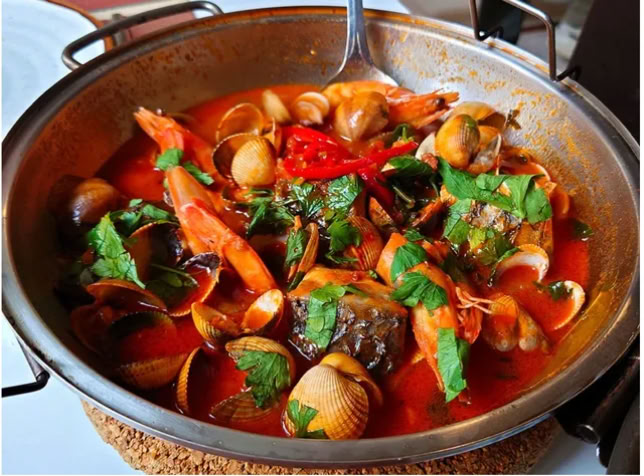 Cataplana de Marisco ,Eén van de bekendste gerechten is Cataplana de Marisco waarvan verse zeevruchten het hoofdingrediënt zijn! Het gerecht is een soort stoofpotje gevuld met wijn, tomaten, kruiden en allerlei soorten vis afhankelijk van wat er recent gevangen is. Ook de typische pan ,waarin de visschotel bereid wordt ,noemt men een Cataplana